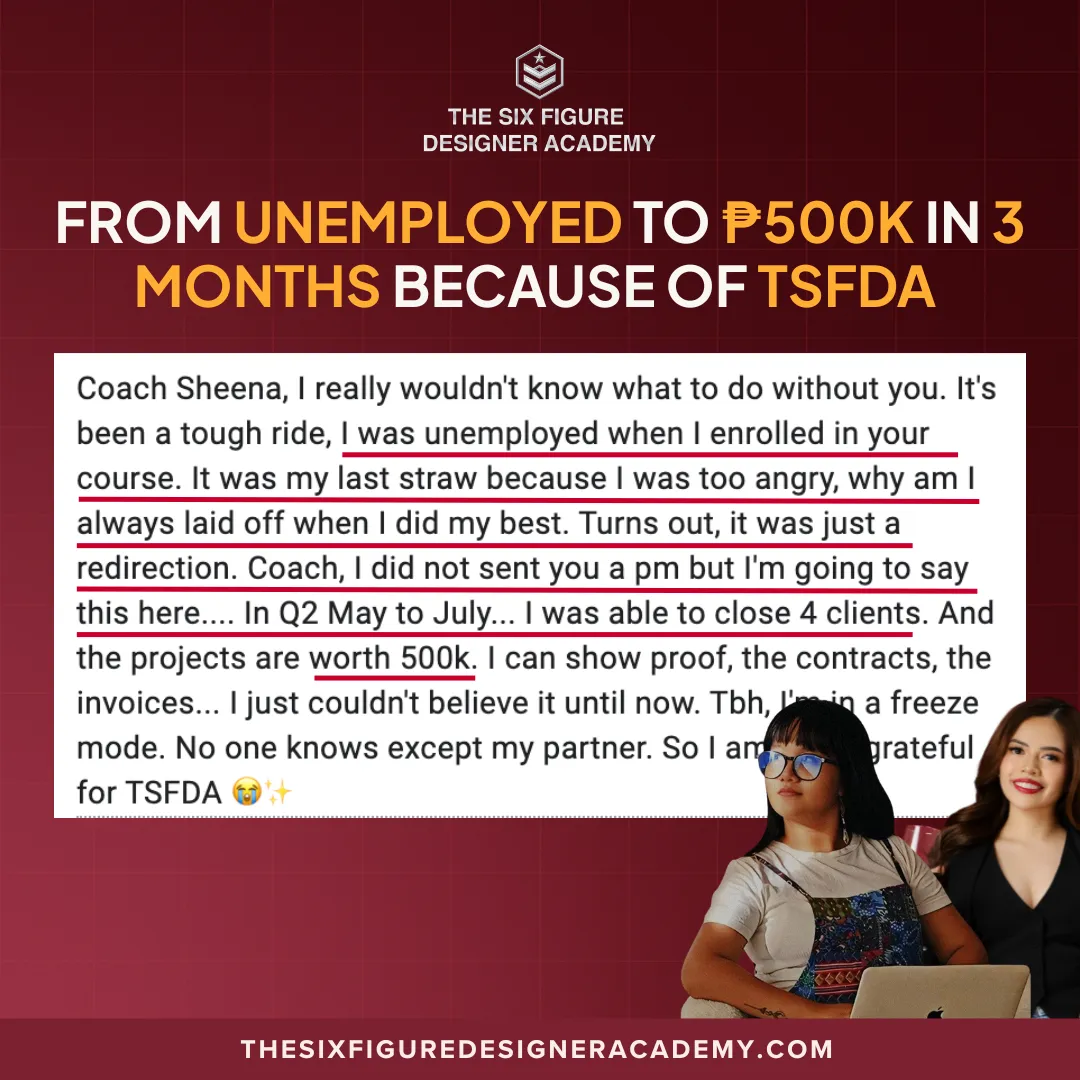 TSFDA has everything you need to learn on how to become a brand and web designer. After just a month of studying and implementing everything that I've learned from the course, I was able to secure my FIRST ever brand and a web design client. I was able to get back 10X of what I paid for. It was one of the best investments that I really made on my business.