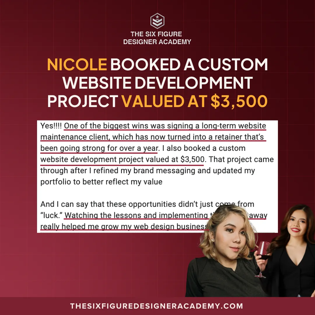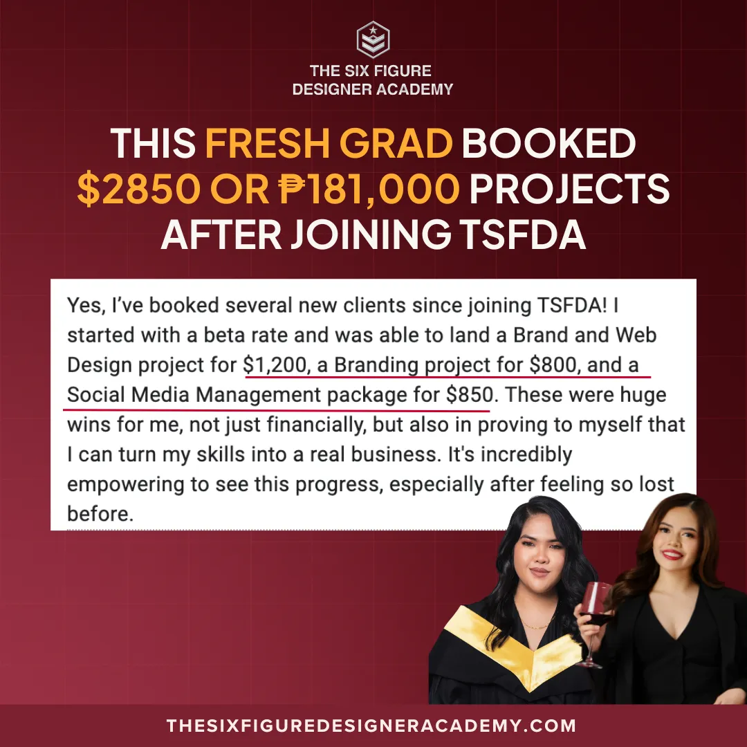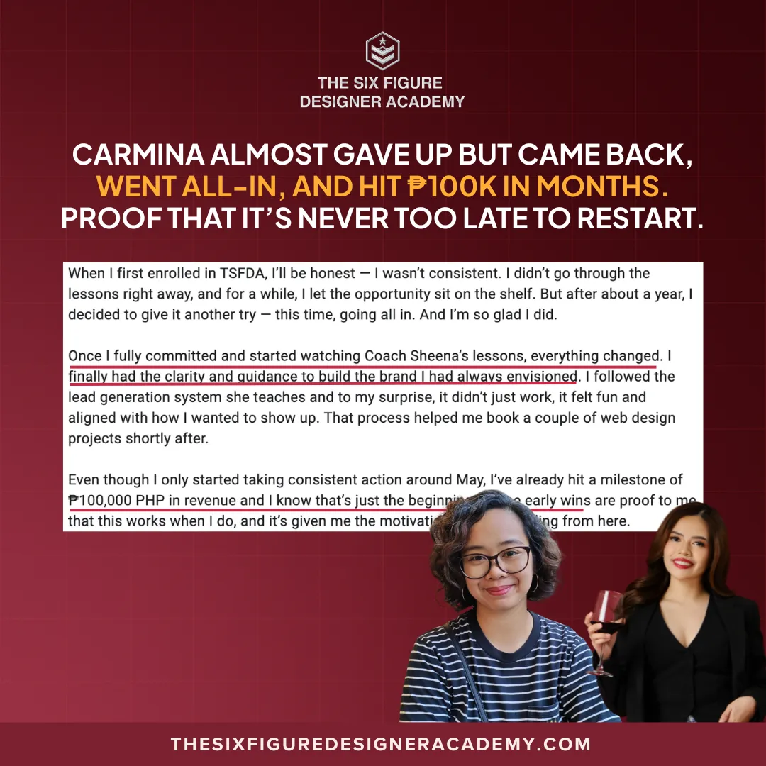 Inside The Six Figure Designer Academy, I’m giving you the exact roadmap I used to go from earning ₱18,000 for my first branding project… to confidently closing 6-figure deals and building a thriving brand and web design business.