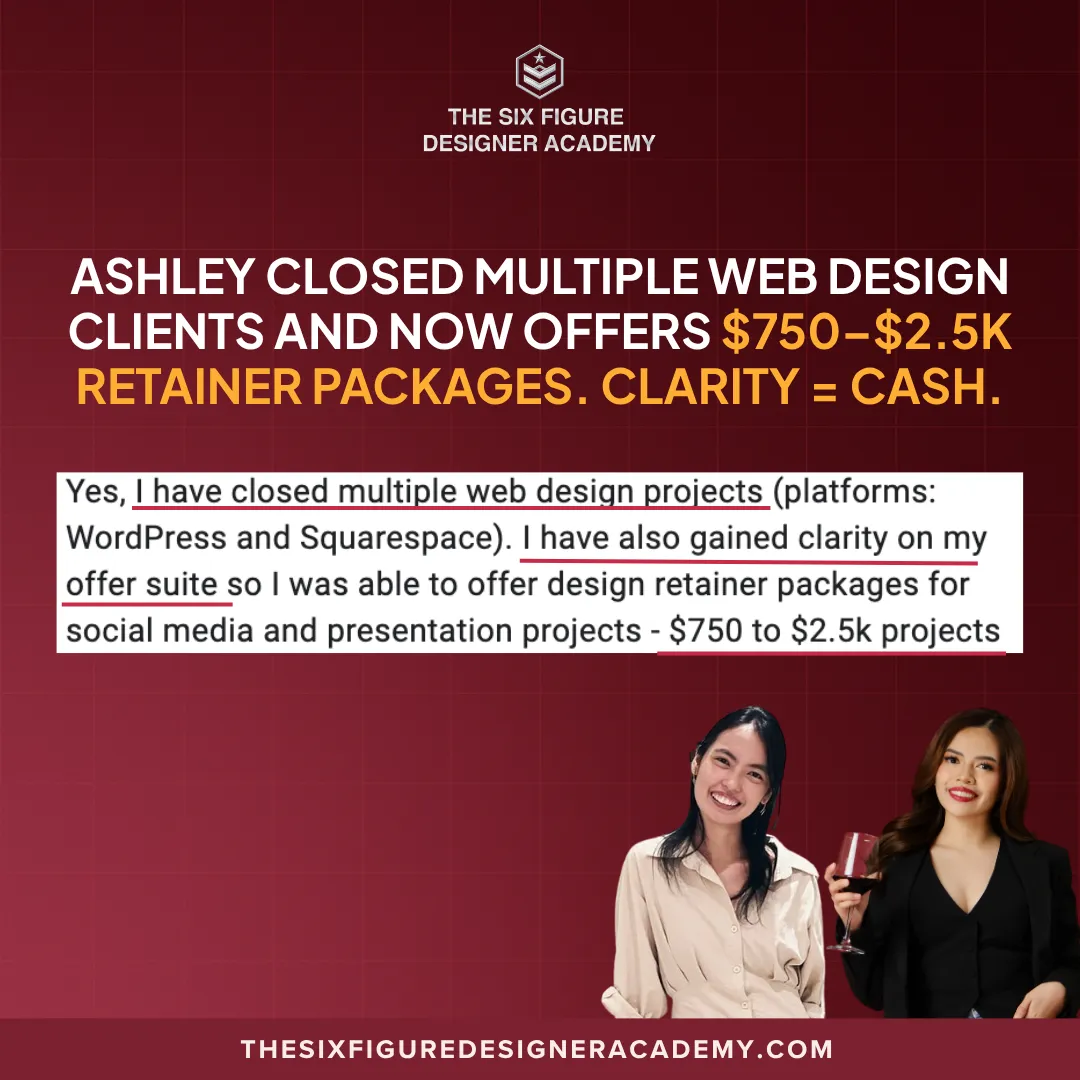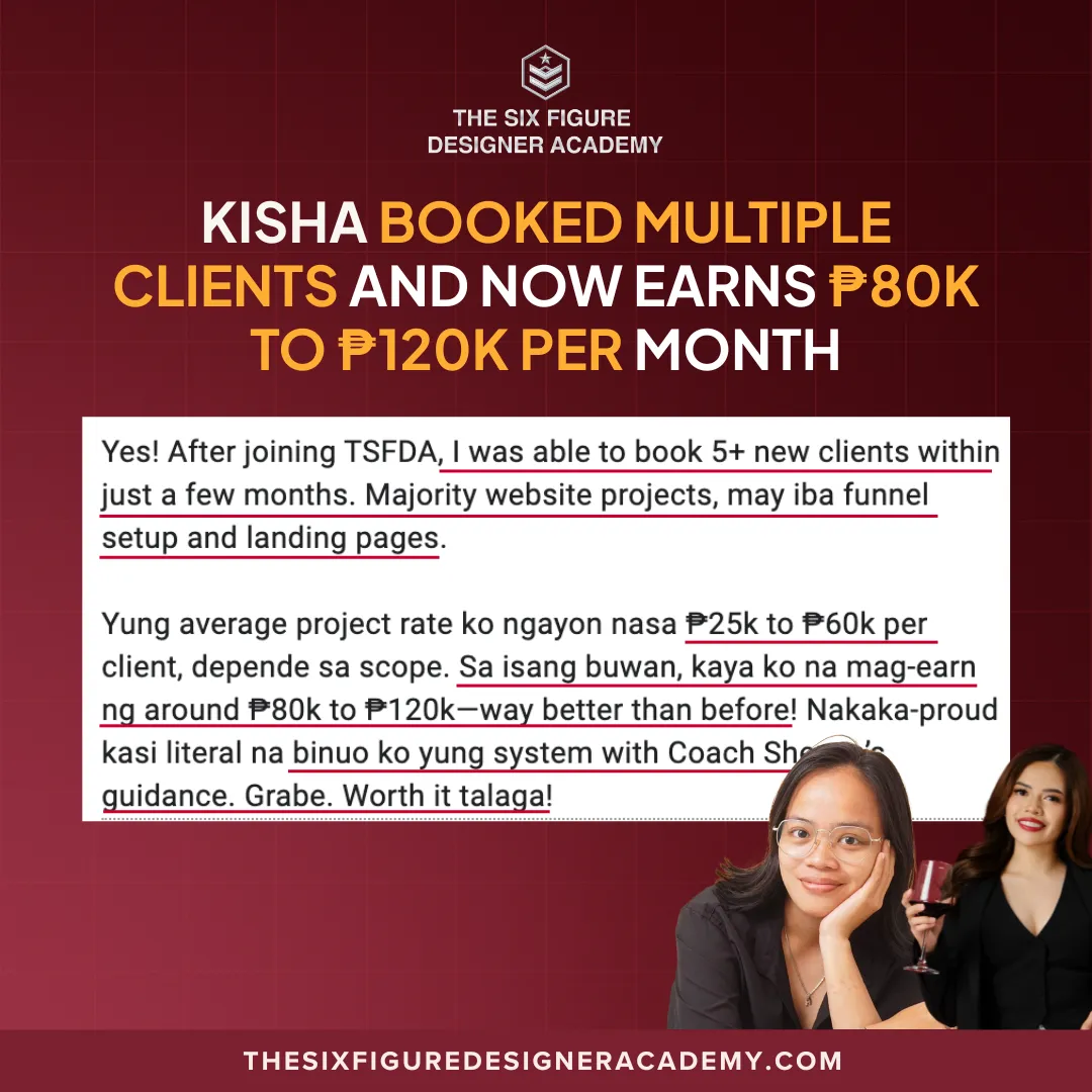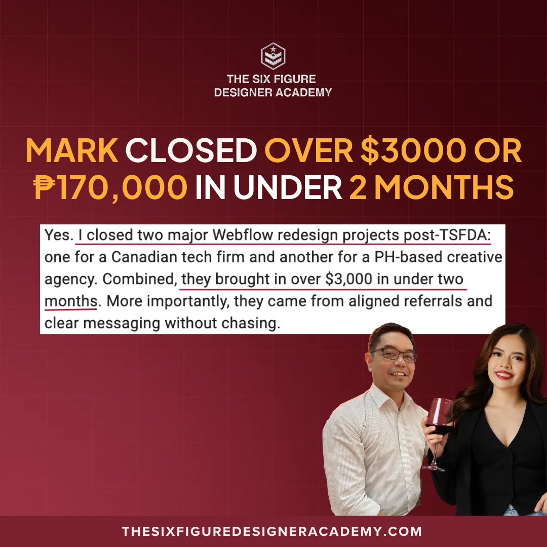 Today, I run The Six Figure Designer Academy, a program that’s helped over 500+ Filipino creatives create thriving, premium design businesses — without coding, degrees, or years of experience.